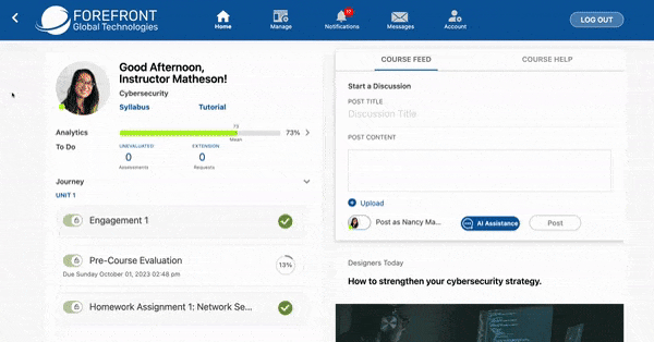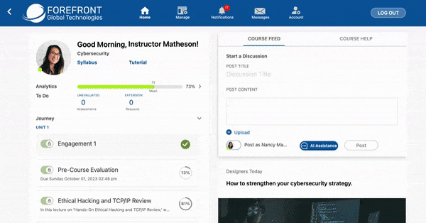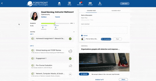- Journey: This provides a snapshot of the learner's progress on the course content and assessments. It is precisely what the learner sees within their Course Journey on the Course Home Page. This will show whether certain content elements and assignments are completed (green checkmark) or in progress.
